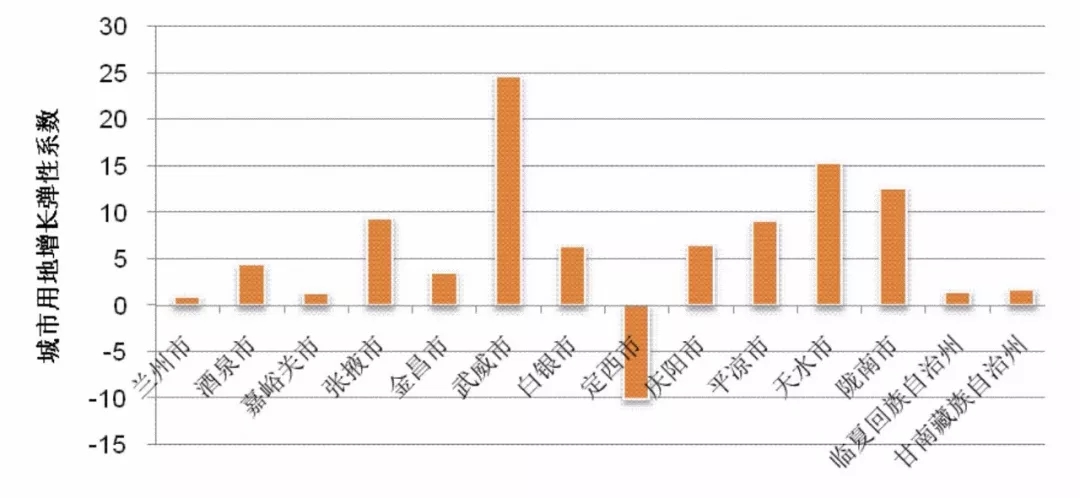圖9 甘肅省地級城市用地增長彈性系數(shù)統(tǒng)計圖