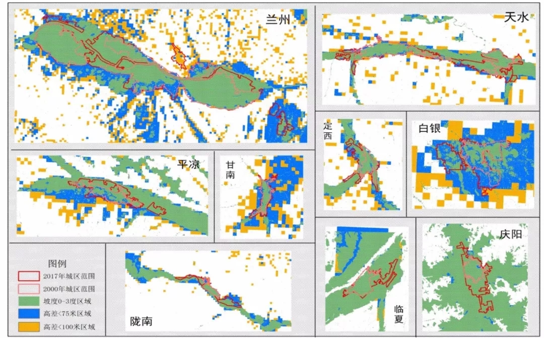 城市土建工程以坡度0-3°的平地為基礎(chǔ),城區(qū)空間擴張首選區(qū)域是與老城區(qū)相鄰的坡度0-3°的平地區(qū)域。在平地資源稀缺的城市如蘭州市、天水市、平?jīng)鍪?、隴南市、白銀市、甘南藏族自治州部分坡度大于3°相對高差在75米內(nèi)甚至100米以內(nèi)的區(qū)域也被開發(fā)為城市建設(shè)用地。