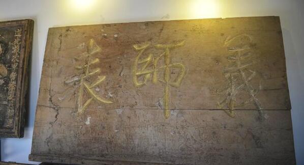 歷經(jīng)歲月洗禮,一部分文物保存了下來。圖中這塊“忠義師表”匾額,曾被當?shù)剜l(xiāng)民拿回家做床板,鋸掉了“忠”字。