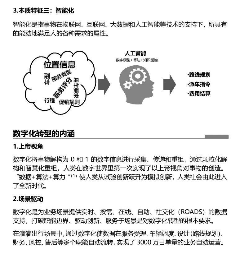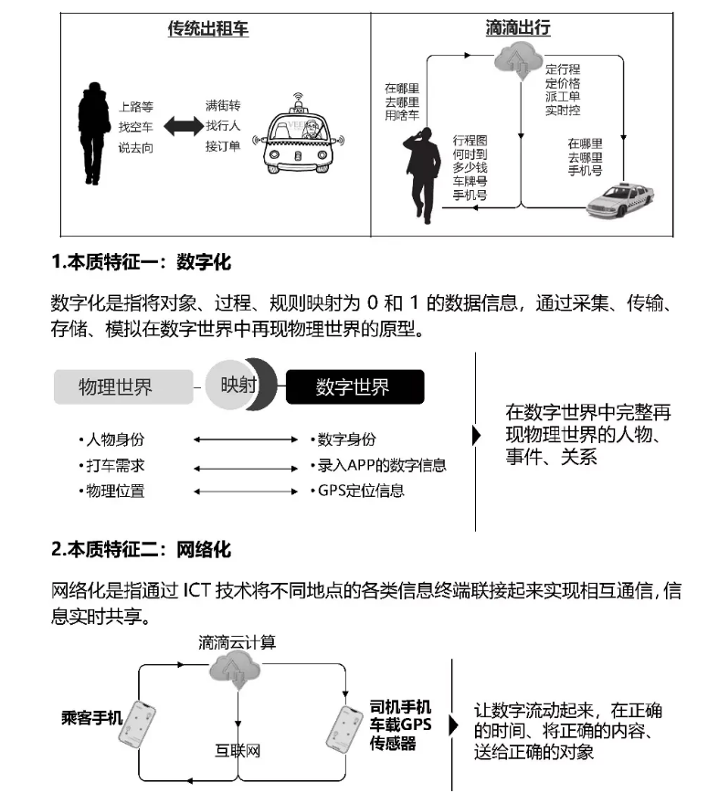 數(shù)字化轉型的本質:從傳統(tǒng)的出租車到現(xiàn)代的滴滴出現(xiàn),就是一個數(shù)字化的轉型場景,其具備數(shù)字化、網(wǎng)絡化、智能化三個本質特質。