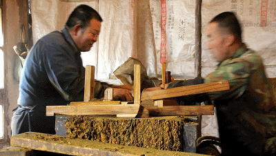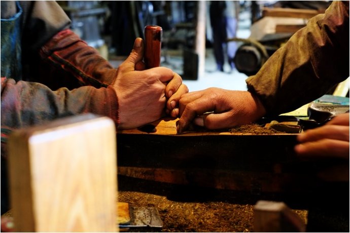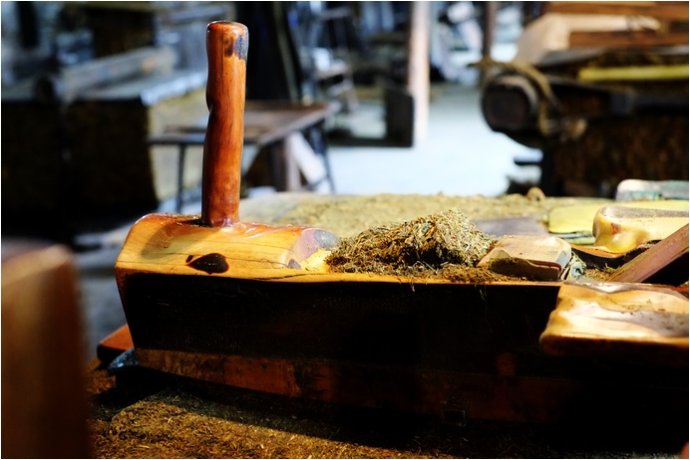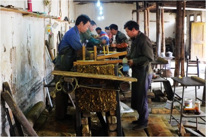 兩位老哥正在忙碌著推刨水煙。 水煙制作由兩人合作,推煙、壓煙的過(guò)程需要兩個(gè)人緊密配合。