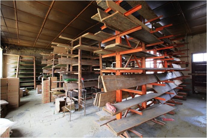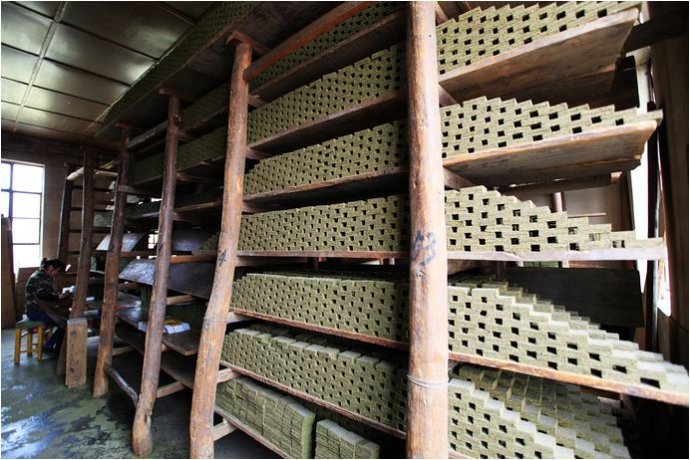 廠子的人帶我先進(jìn)的是晾曬和包裝車間,晾曬水煙的地方都是木架木板,大部分架子都空著,兩頭的幾個(gè)架子堆滿了正在晾干的水煙塊。車間里一股濃濃的煙草的味道。